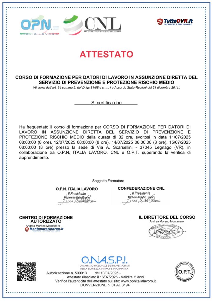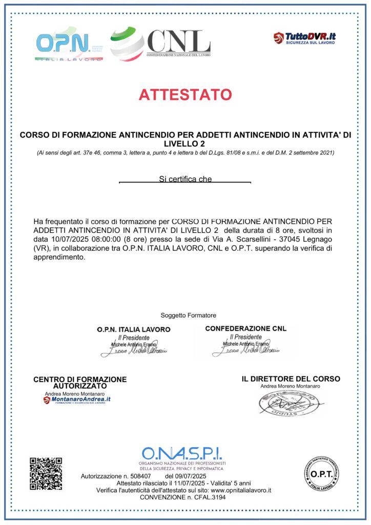 Il nostro team è qualificato e formato secondo le più recenti normative sulla sicurezza, con certificazioni ufficiali RSPP e Antincendio livello 2. Garantiamo affidabilità e massima tutela per clienti e collaboratori, offrendo servizi conformi agli standard di sicurezza richiesti nel settore.